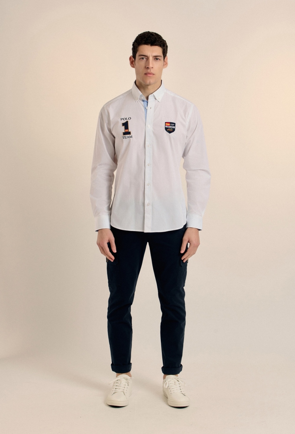 Camisa sport color blanco, en algodón popelín, con cuello abotonado y detalles bordados en pecho y espalda. Tapeta central con botones blancos personalizados. Esta camisa se caracteriza por los diferentes bordados.