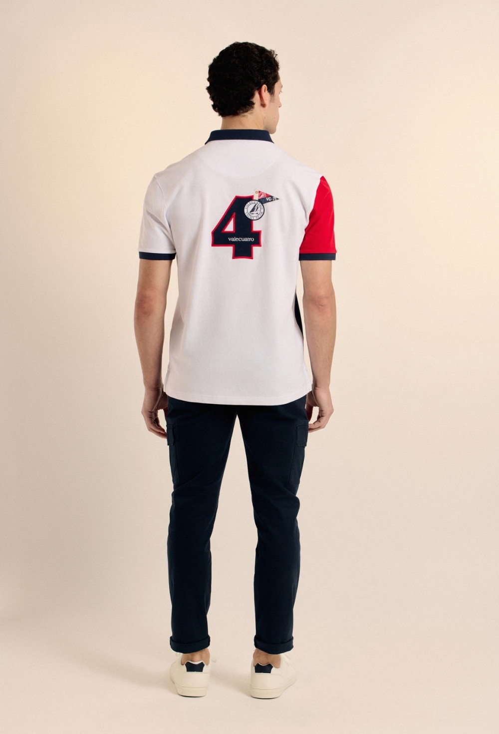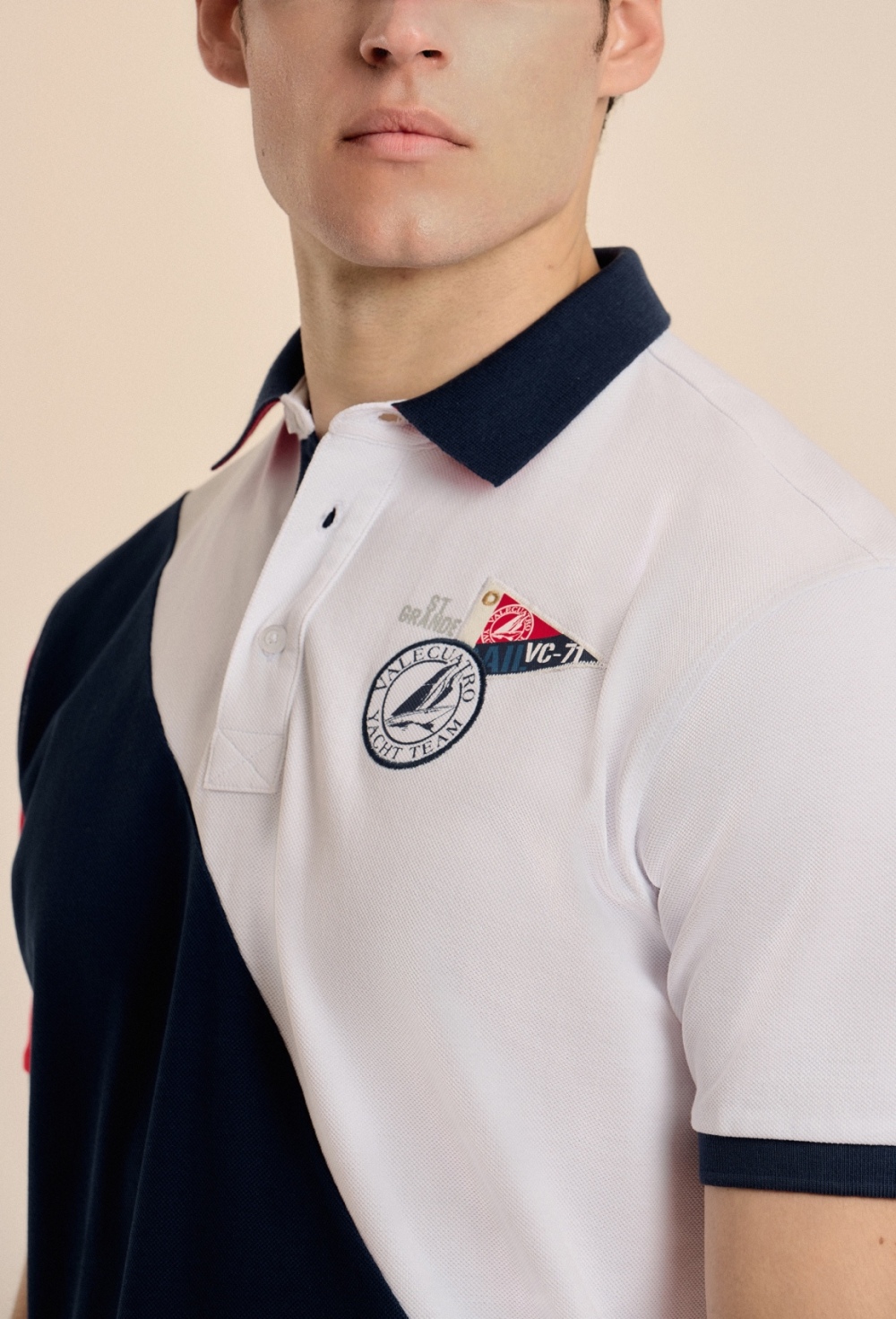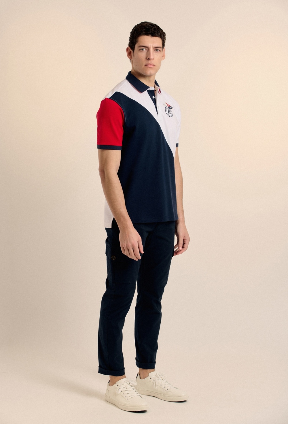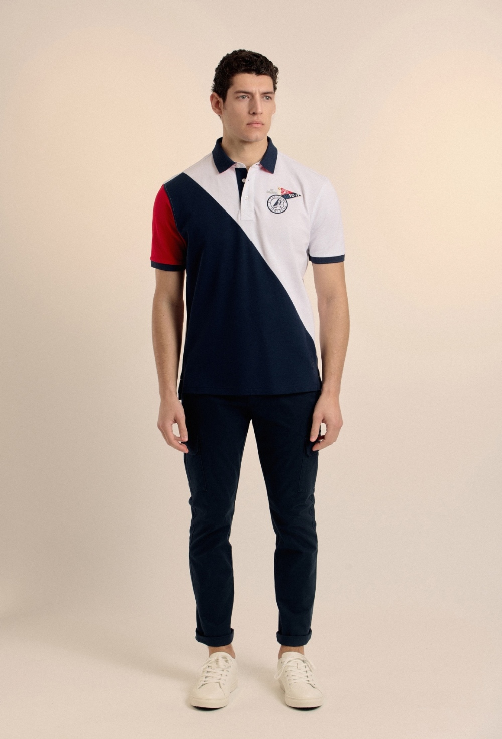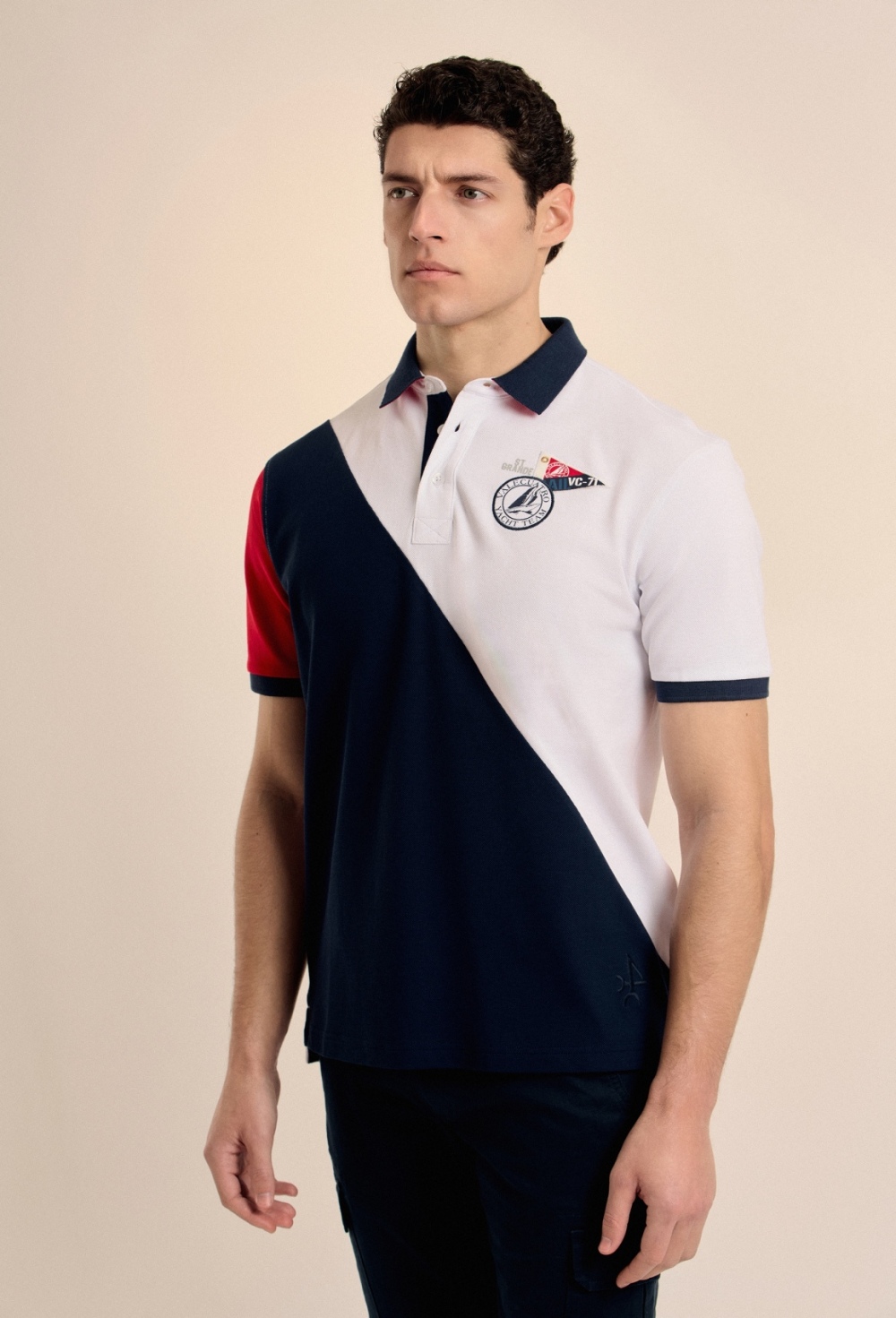 Polo azul marino de manga corta confeccionado en 100% algodón piqué con escudo bordado en pecho y espalda. Acabados acanalados y cierre mediante tapeta de dos botones. Bajo con aberturas laterales. Prenda caracterizada por las estructuras y los bordados..