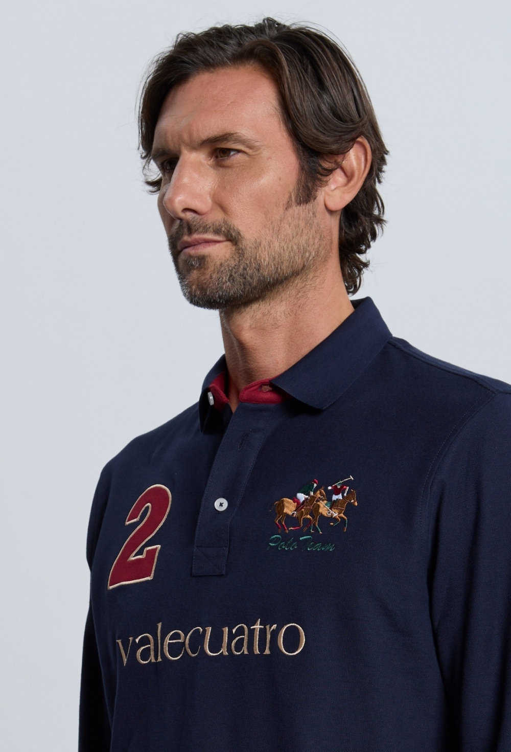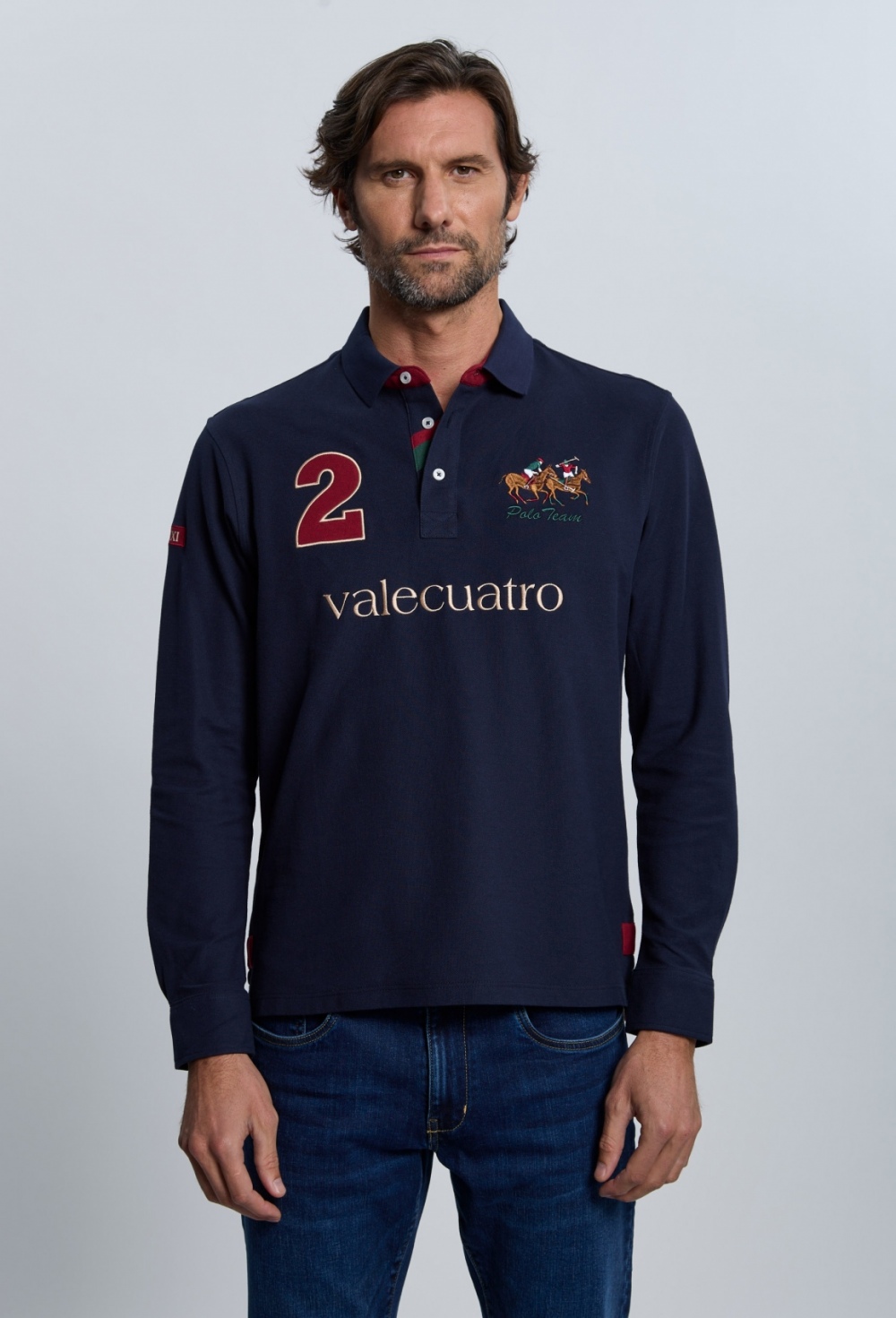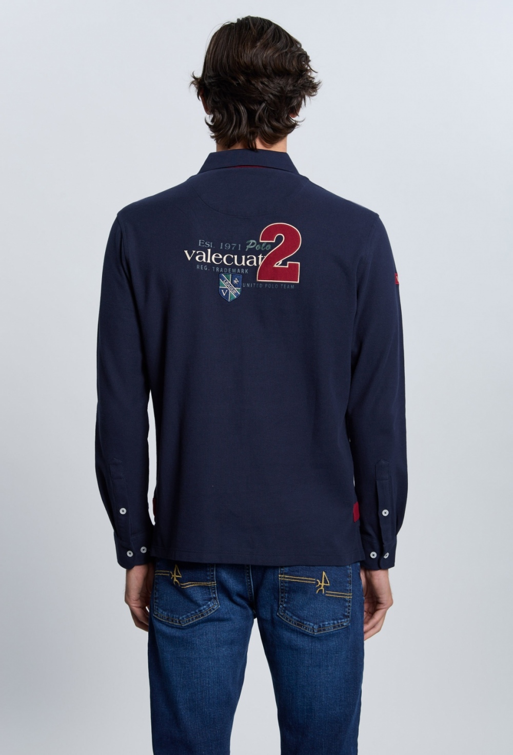 Polo de manga larga azul marino confeccionado en 100% algodón, se caracteriza por los bordados del pecho y de la espalda. Cuello clásico y cierre mediante tapeta de dos botones de color blanco personalizados.