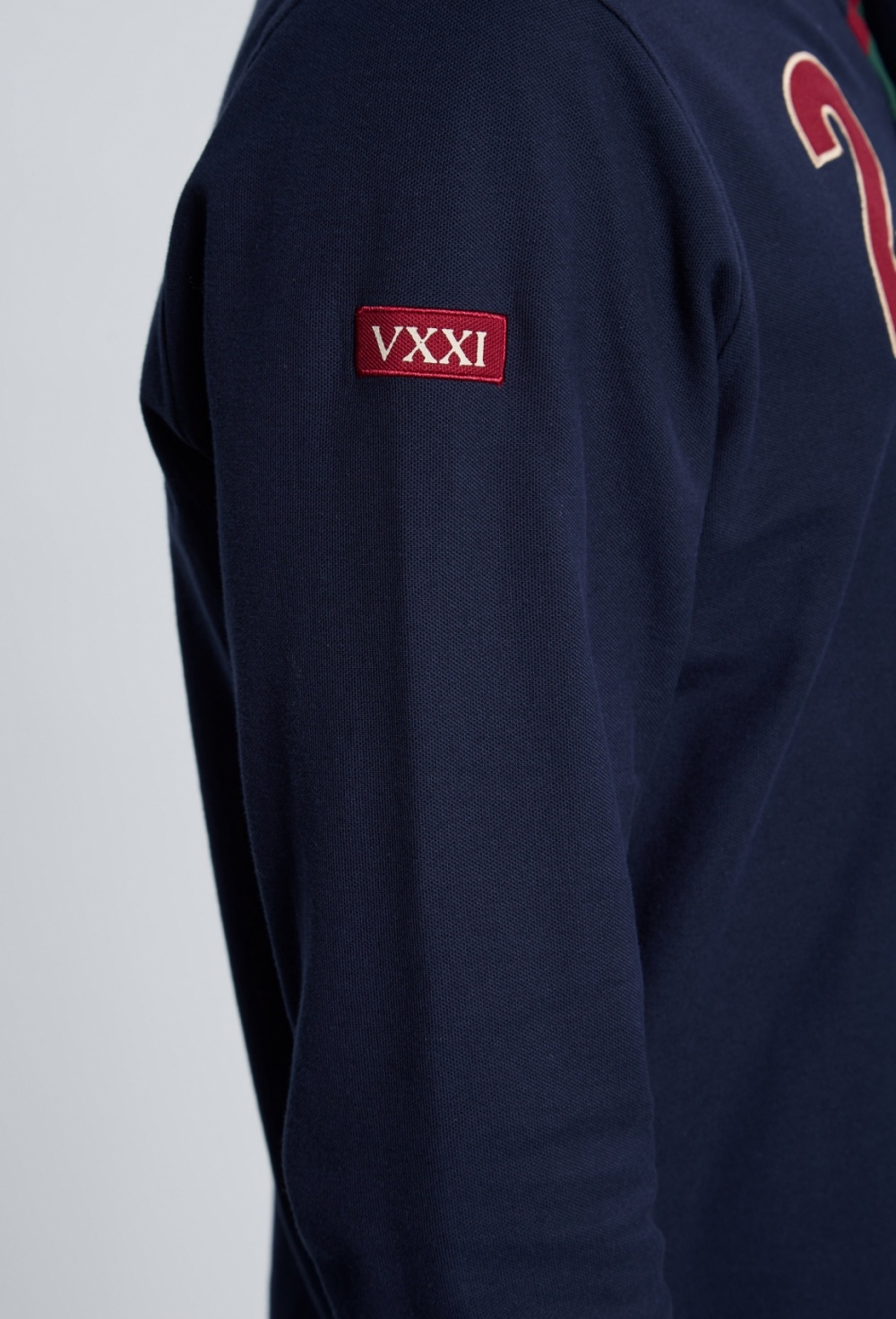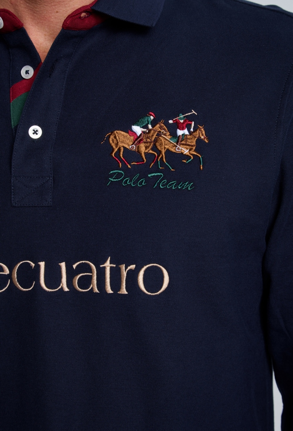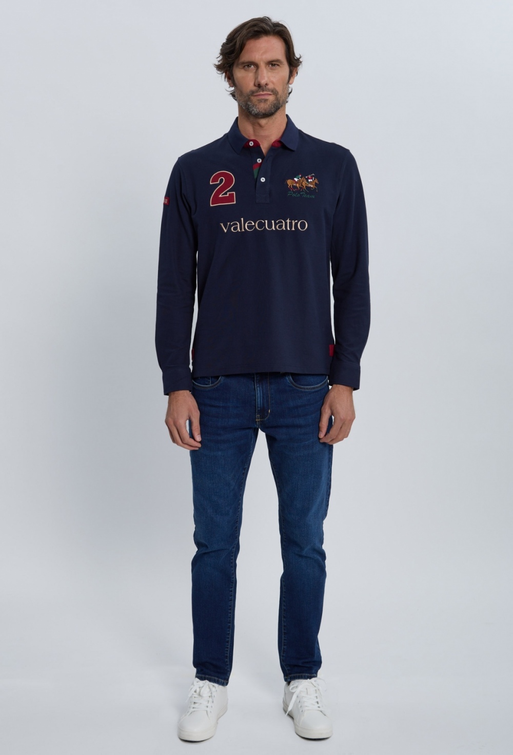 Polo de manga larga azul marino confeccionado en 100% algodón, se caracteriza por los bordados del pecho y de la espalda. Cuello clásico y cierre mediante tapeta de dos botones de color blanco personalizados.